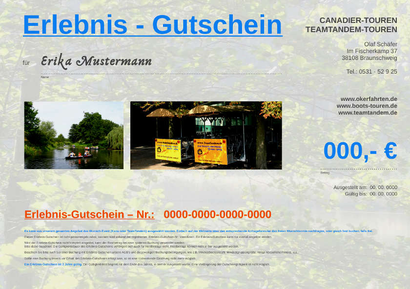 Erlebnis-Gutschein für eine Kanutour oder TeamTandem-Tour!